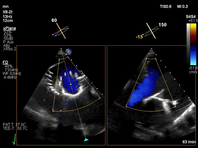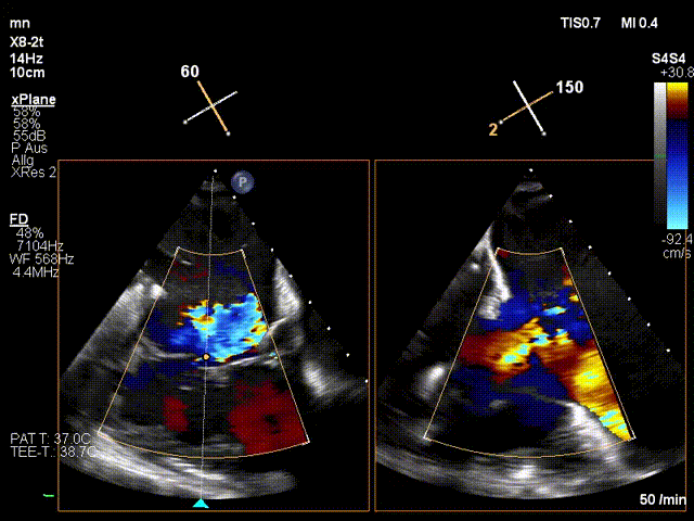 手術(shù)在全麻狀態(tài)下進行。在加拿大圣保羅醫(yī)院的Anson Cheung教授的指導(dǎo)參與下,術(shù)者采用經(jīng)右側(cè)頸靜脈入路的方式將輸送器送入患者心臟內(nèi),在TEE及DSA引導(dǎo)下調(diào)整輸送器頭端角度,使得輸送器與三尖瓣瓣環(huán)平面垂直。在輸送器進入右心室后釋放室間隔錨定裝置,而后釋放瓣葉夾持件(2個耳片結(jié)構(gòu))成垂直狀態(tài)。在TEE及DSA確定夾持件固定至三尖瓣葉根部且位于右室側(cè)后釋放人工瓣心房側(cè)盤片。隨后調(diào)整瓣膜同軸性以及室間隔錨定件位置(貼合室間隔),前推藏針管并固定,進而釋放室間隔錨定裝置,并再次確認瓣膜位置、穩(wěn)定性及同軸性,合攏輸送鞘后撤出輸送器,完成LuX-Valve Plus人工三尖瓣瓣膜的植入。