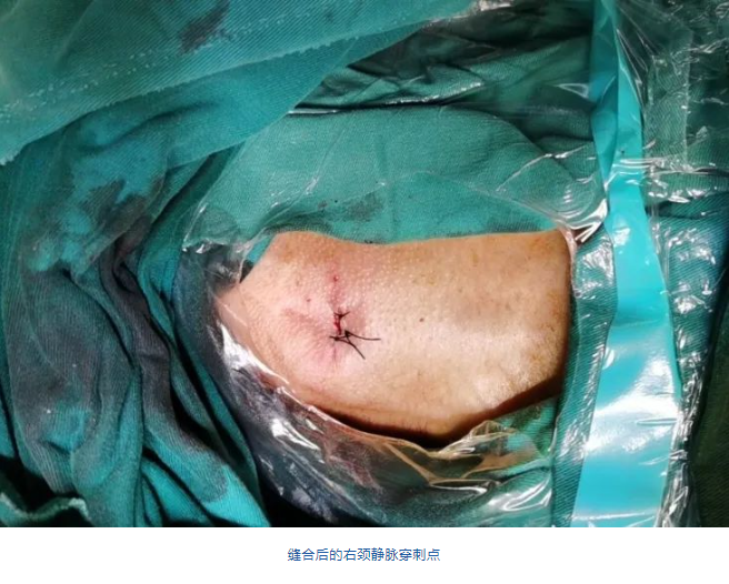 團(tuán)隊前期經(jīng)過多次討論,制定了周密的手術(shù)策略和預(yù)案。由于患者已是近九旬的超高齡老人,傳統(tǒng)外科開胸手術(shù)風(fēng)險極高,純介入經(jīng)血管三尖瓣替換能夠明顯減少創(chuàng)傷。術(shù)中陳茂及馮沅教授結(jié)合體表定位在造影指示下精準(zhǔn)穿刺右側(cè)頸靜脈并預(yù)置兩把血管縫合器。成功建立經(jīng)皮血管入路后在食道超聲和DSA的引導(dǎo)下順利完成人工瓣膜植入,術(shù)后超聲和造影顯示人工三尖瓣同軸性良好,瓣架固定牢靠,無反流和瓣周漏,平均跨瓣壓差降為1mmHg。術(shù)畢收緊預(yù)置的血管縫合器縫線完成止血,縫合效果滿意,在手術(shù)室即刻拔除氣管插管。
