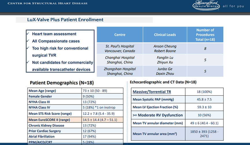 2023年6月7日,經導管瓣膜治療會議(TVT)在美國菲尼克斯舉行。作為全球心臟瓣膜介入治療領域的頂級盛會之一,TVT吸引著來自全球瓣膜領域的專家學者的目光。在本次大會上,來自美國Henry Ford Hospital的Dee Dee Wang教授報告了關于LuX-Valve Plus經導管三尖瓣置換系統的早期救治性臨床數據以及分享了LuX-Valve Plus手術術中的超聲指引經驗。