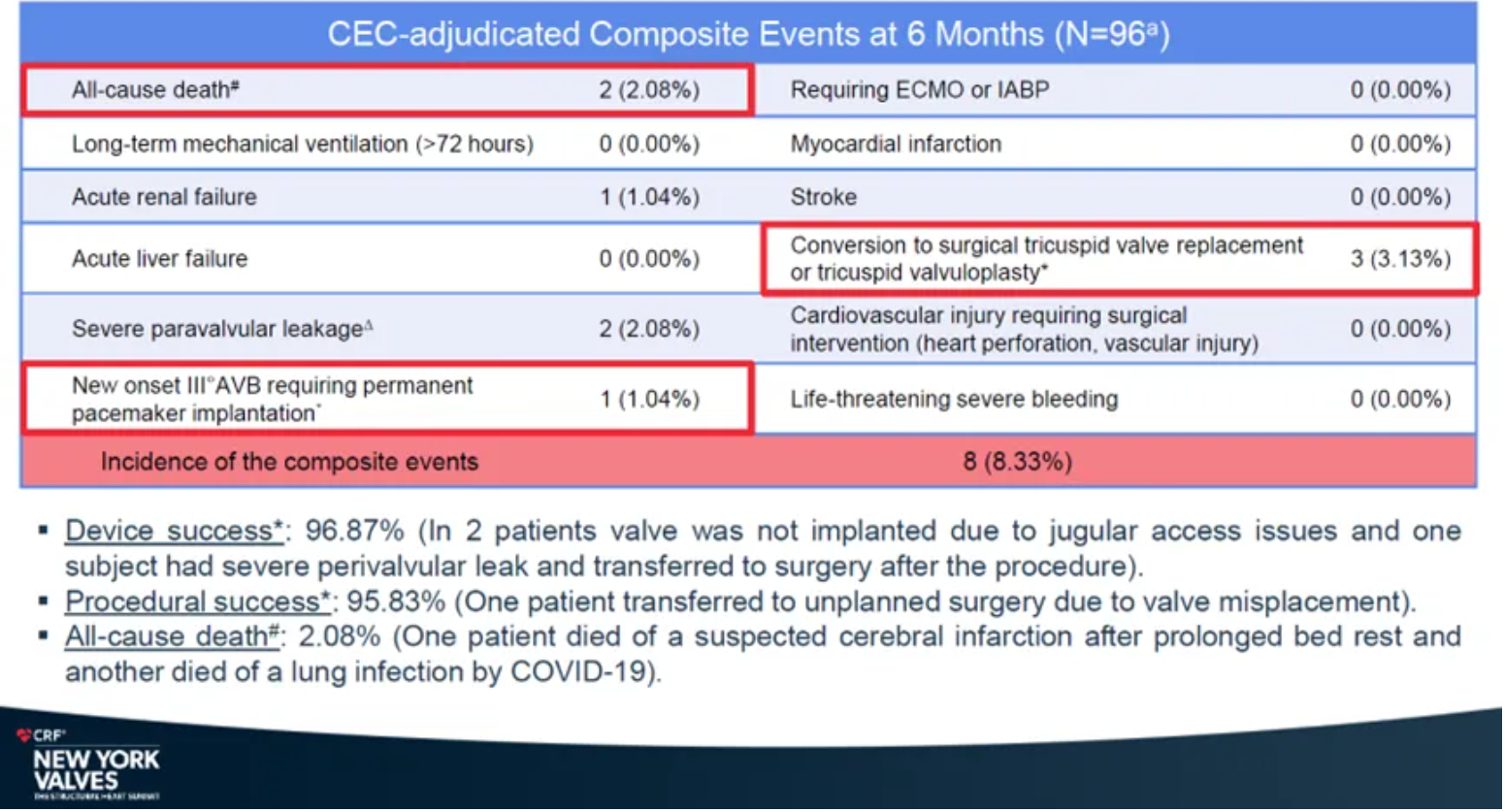 安全性結果顯示,復合事件發(fā)生率為8.33%。心梗、卒中、使用ECMO(體外膜肺氧合)或IABP(主動脈內球囊反搏)、急性肝功能衰竭、長期機械通氣(>72小時)、需要外科干預的心血管損傷(心臟穿孔、血管損傷)、危及生命的大出血事件發(fā)生率均為0。全因死亡率僅為2.08%,急性腎臟衰竭、重度瓣周漏和中轉外科三尖瓣置換或成形術發(fā)生率分別為1.04%、2.08%和3.13%。新發(fā)III度房室傳導阻滯需植入永久心臟起搏器的發(fā)生率僅1.04%。