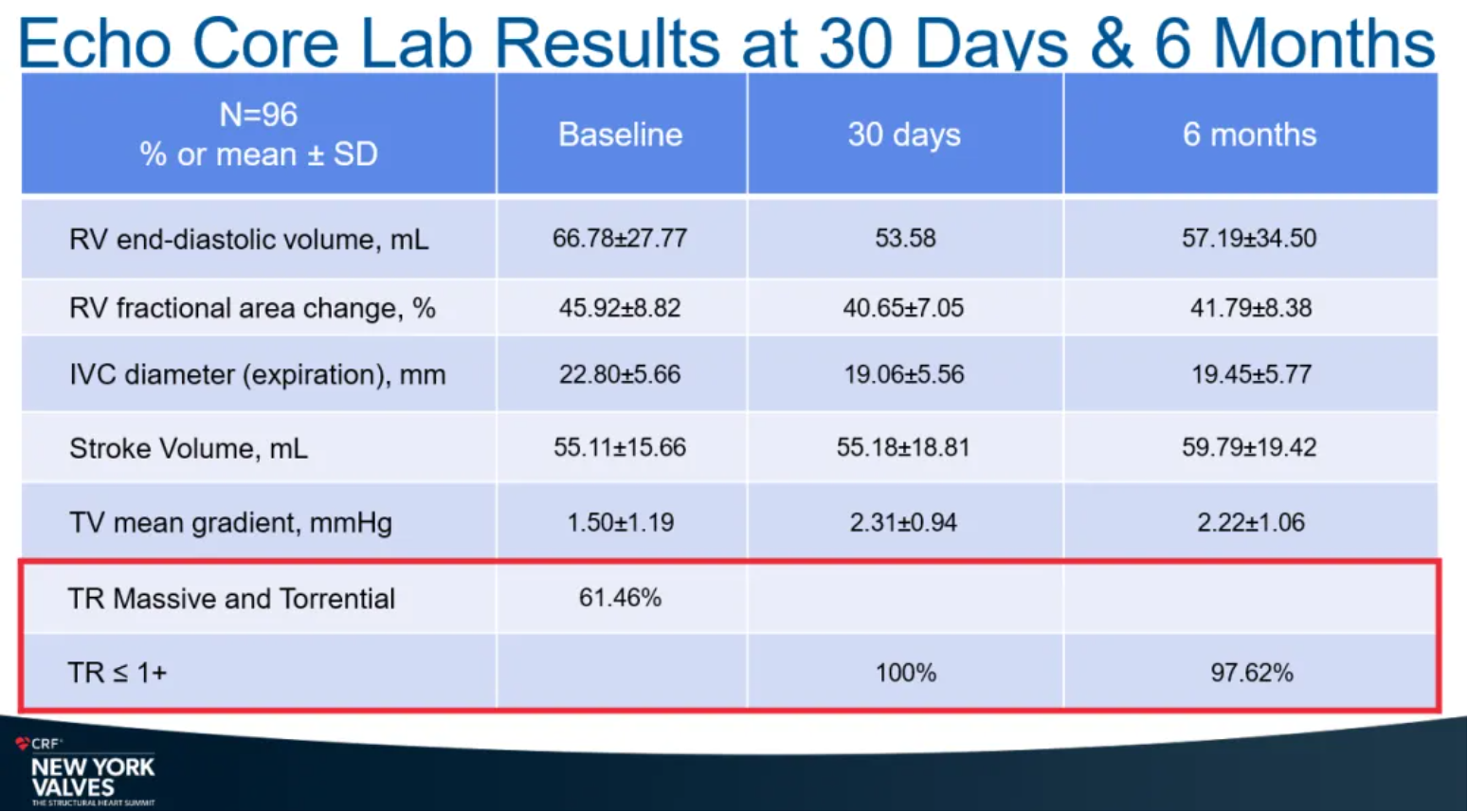 有效性結果顯示,患者的反流等級、心功能等級,以及生活質量顯著改善。100%的患者在30天顯示無中度及以上反流,97.62%的患者在6個月時顯示無中度及以上反流。同時,根據(jù)超聲數(shù)據(jù)顯示,患者右心系統(tǒng)重構也獲得受益。