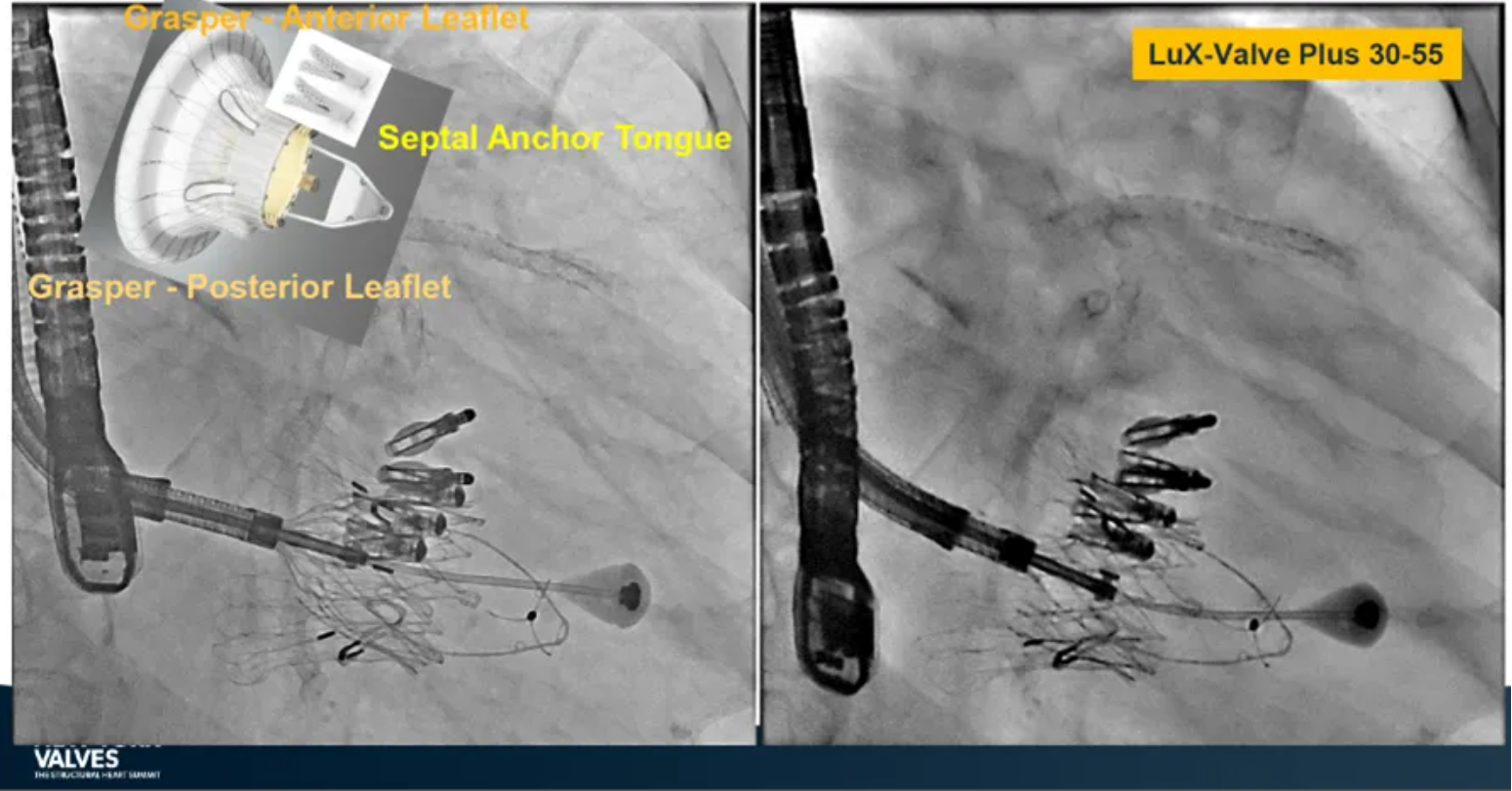 本次術式中,LuX-Valve Plus的植入緊隨二尖瓣修復術式之后,且并未取出前期植入的三尖瓣修復夾,這意味著LuX-Valve Plus在患者有過二尖瓣和三尖瓣修復夾植入情況下的兼容性,并且?guī)砹擞行У闹委熃Y果。此外,這不僅體現(xiàn)了LuX-Valve Plus可以與二尖瓣術式并行,更可以兼容三尖瓣原位的其他修復夾產品。