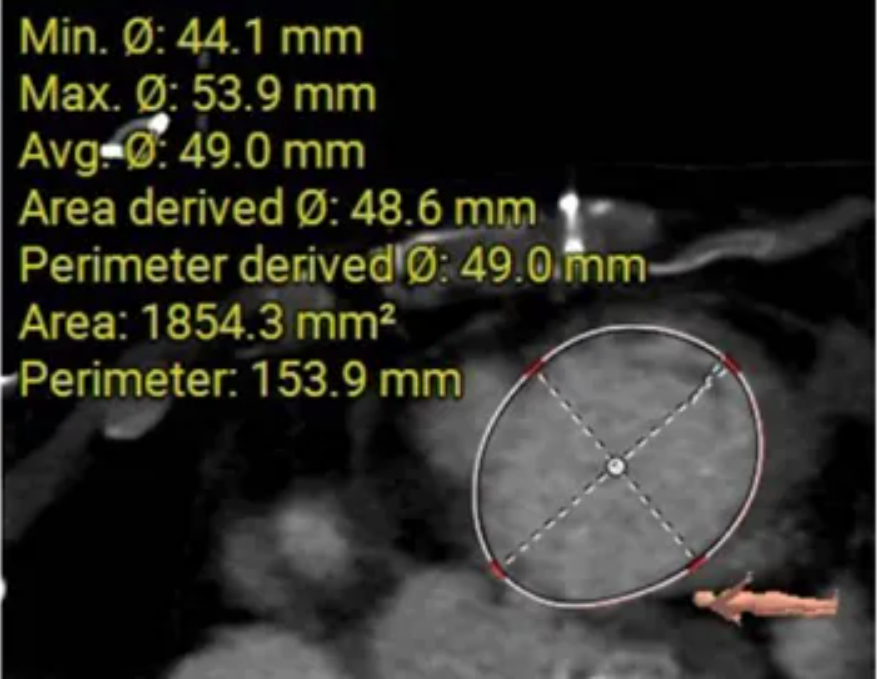 術前CT測量:三尖瓣瓣環最大徑53.9mm,周長平均徑49mm,瓣環顯著擴張。