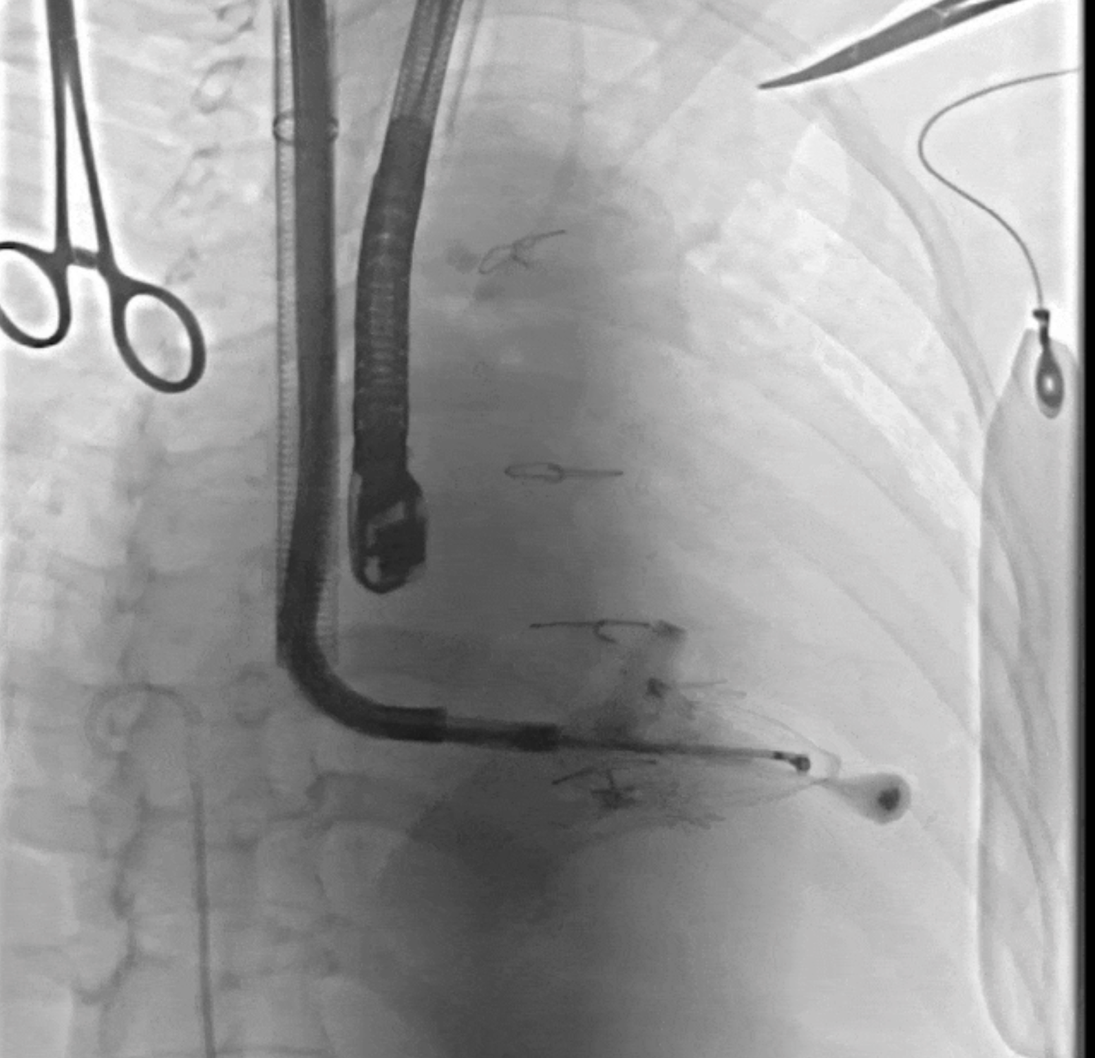 術中DSA所見:經LuX-Valve Plus輸送器系統五向調整,人工瓣膜同軸良好,夾持件均在瓣葉下。